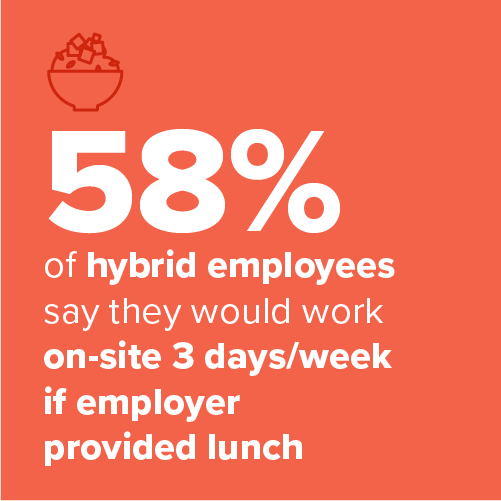In fact, 67% of employees are happier when they have food at work and 58% of hybrid employees say they would work on-site three days a week if their employer provided lunch.
