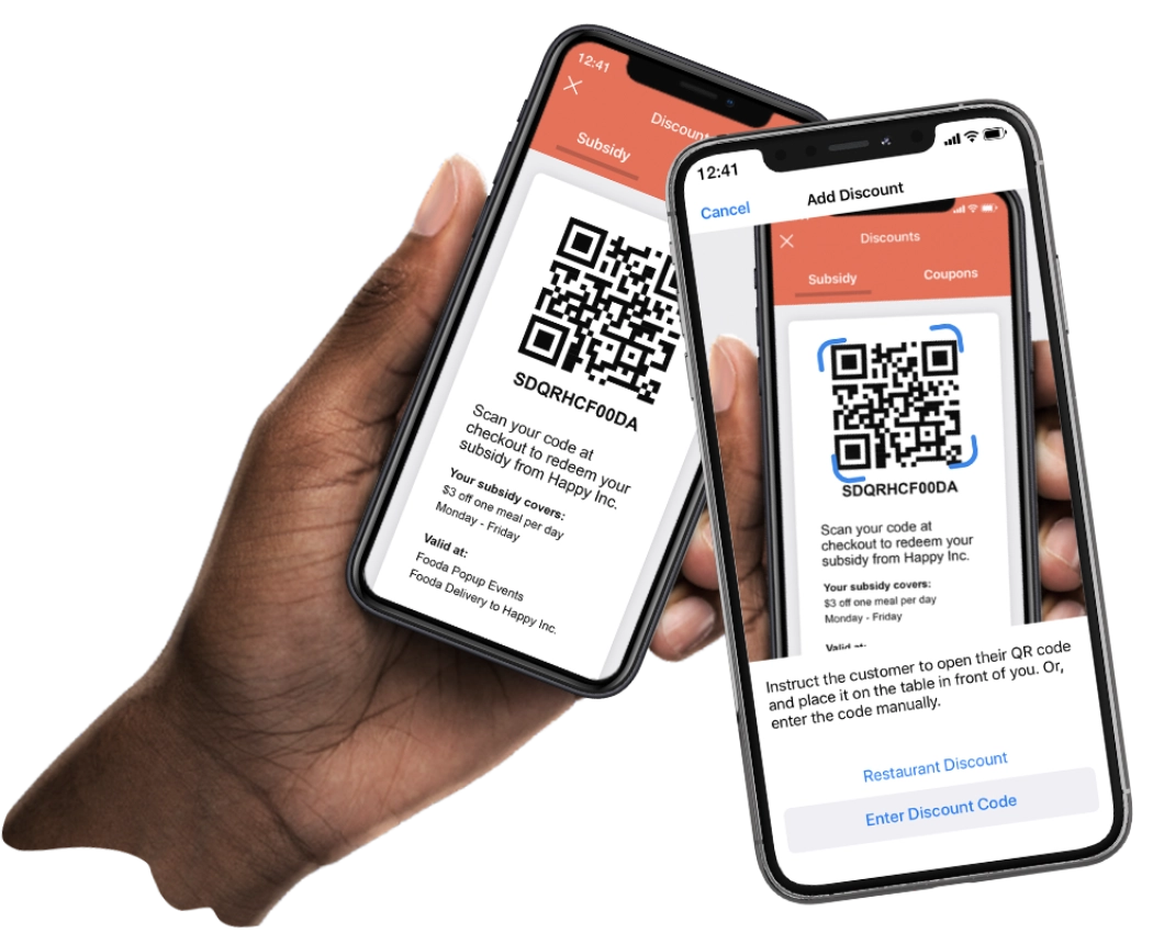 To claim their subsidy, your employees simply need a Fooda account using their work email. To verify identify and usage, employees easily show their QR code in the Fooda App when they check out at a Popup or Food Hall. When placing a mobile order, subsidies are automatically applied.