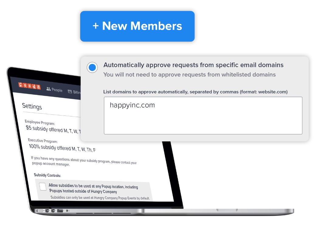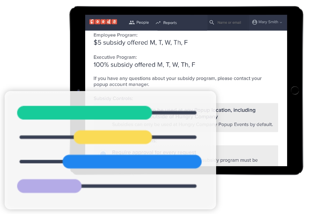 Admins use the Fooda for Business portal to self-manage subsidies directly for teams and individuals. It's full control in real time, which our clients appreciate.