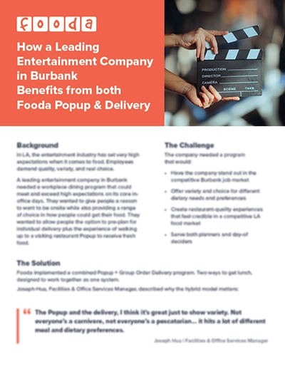In LA, the entertainment industry has set very high expectations when it comes to food. Employees demand quality, variety, and real choice. A leading entertainment company in Burbank needed a workplace dining program that could meet and exceed high expectations on its core in-office days. They wanted to give people a reason to want to be onsite while also providing a range of choice in how people could get their food.